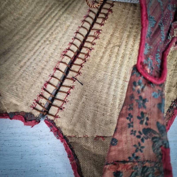 The stays have undergone some repairs over the years, including patches of blue and pink silk fabric on the front and a small one on the back. Another remarkable feature is the large number of 31 hand-embroidered eyelets on each side at the back.