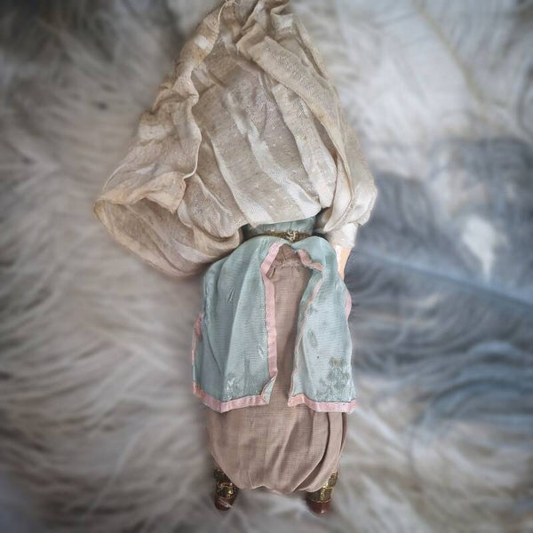 a charming antique doll styled as an oriental belly dancer, inspired by Paul Poiret's famous 1002 Nights party and the Egyptian Revival era. Crafted around 1900 in France, this doll is made of composite material with a body filled with paper and straw.