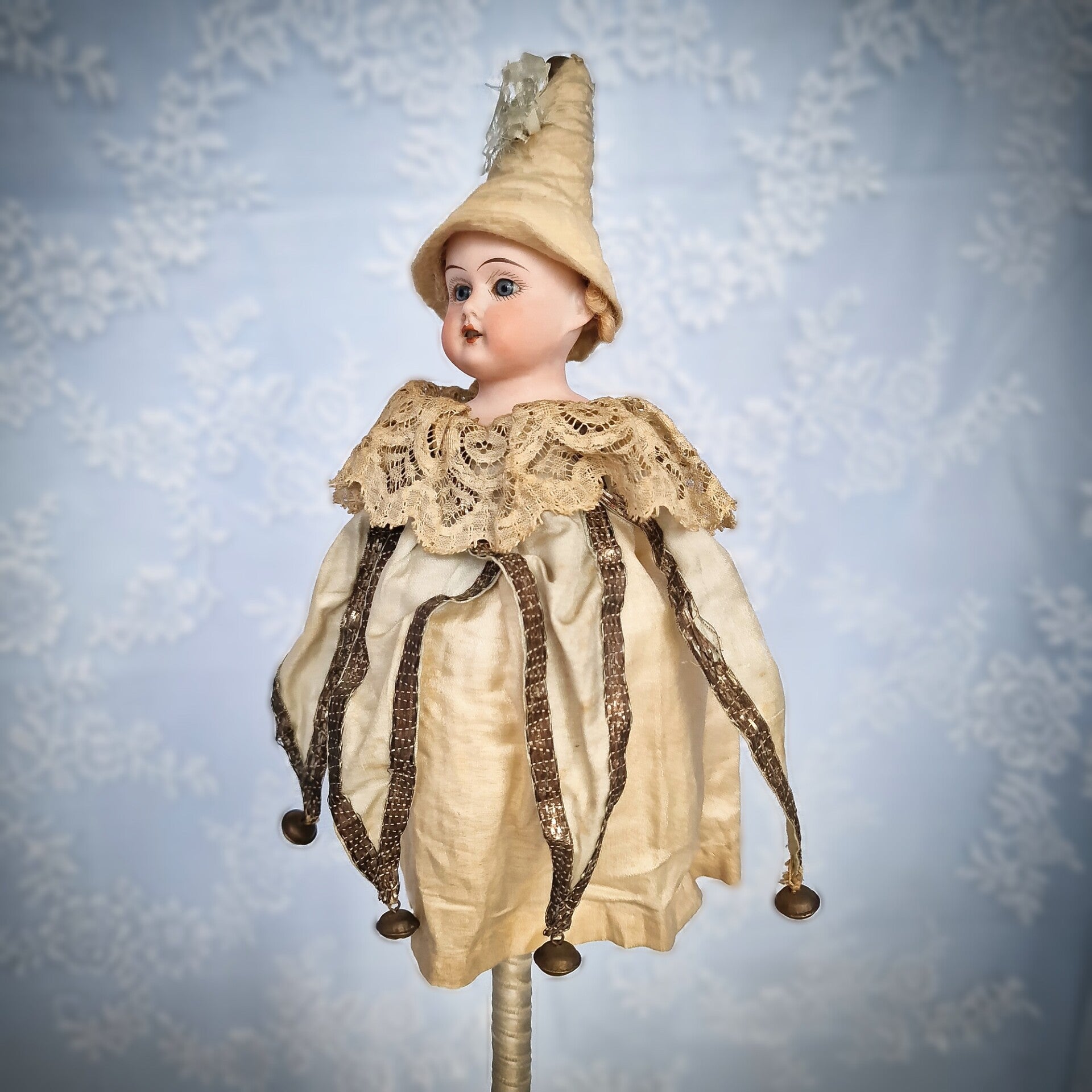 an exquisite antique marotte dressed in a jester style, made around 1900 in Germany. The head is crafted from bisque and features lovely teeth and beautiful eyes. The bisque head is in excellent condition, with no visible damage, repairs, cracks, chips, or restoration.