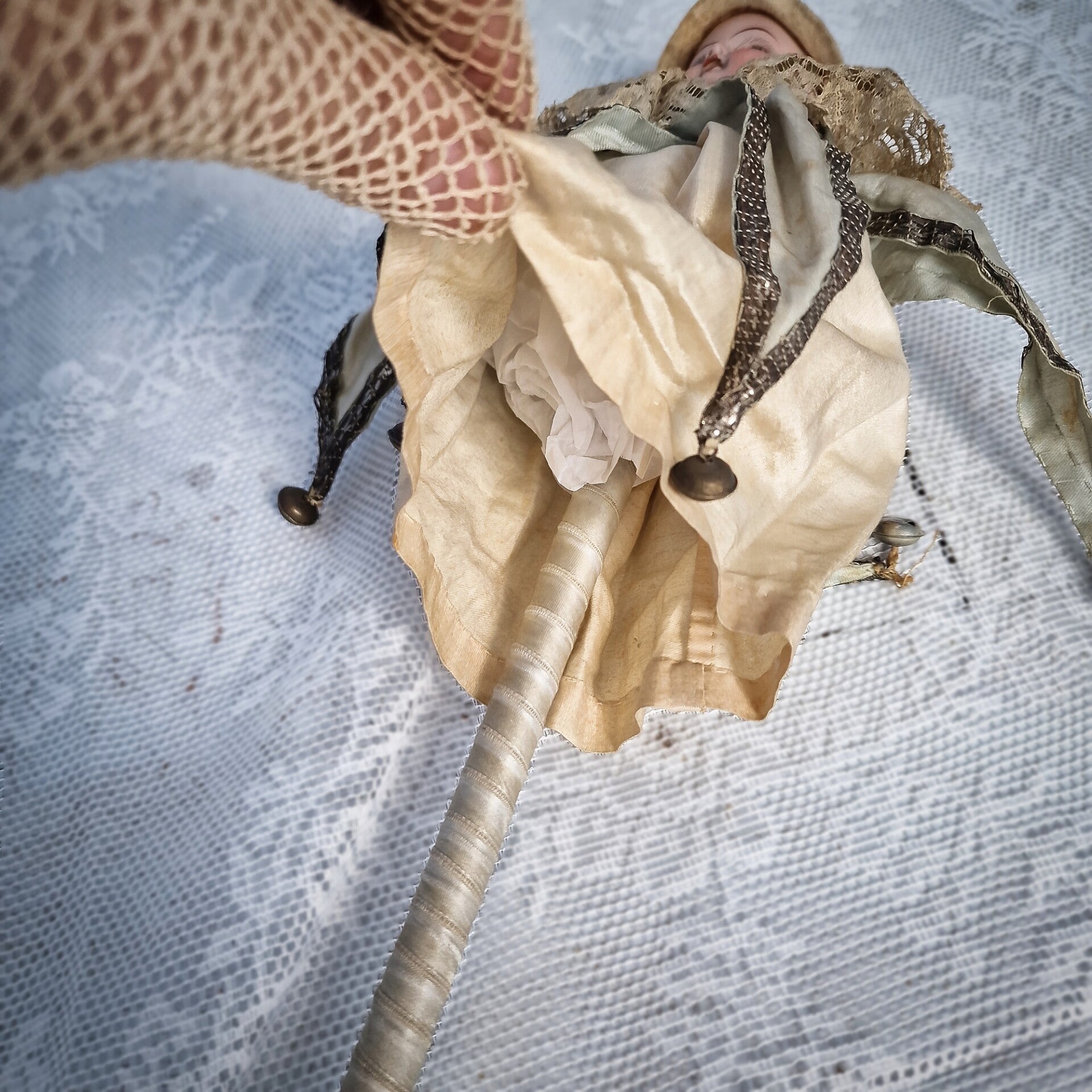 A hat and a piece of wig are glued to the head, adding to its whimsical charm. The costume is well-preserved for its age, complete with bells attached to both the points of the collar and the hat. The marotte is mounted on a long stick wrapped in soft blue satin ribbon, enhancing its elegance.