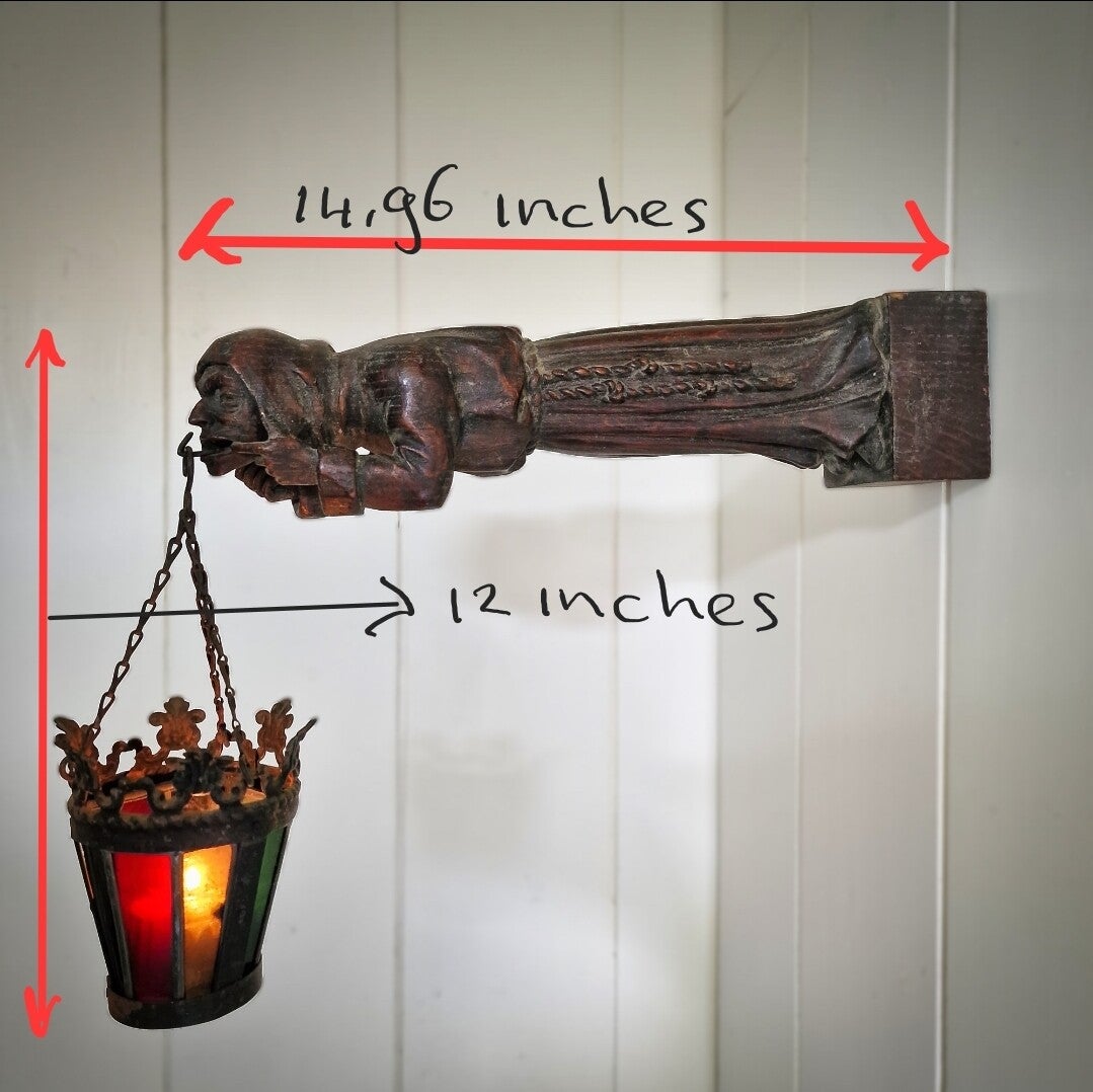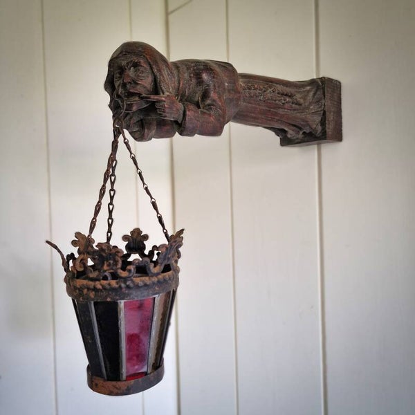 a unique and rare French hand-carved gargoyle wall lamp sconce, made of heavy oak, likely from the late 18th century and originating from a French cathedral. The gargoyle depicts a monk with an open mouth, wearing a habit with a hood over his head and a belt around his waist. The intricate details of the carving, including the folds of the habit, are beautifully executed. The piece has a stunning patina and has not been cleaned, retaining the dust accumulated over centuries.