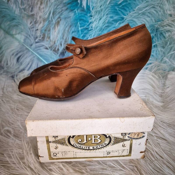a charming pair of French satin flapper shoes in a unique cognac color, complete with their original box. These shoes are well-worn and show signs of wear and age, adding to their vintage appeal. They are perfect as a decorative piece or to complement a period outfit.