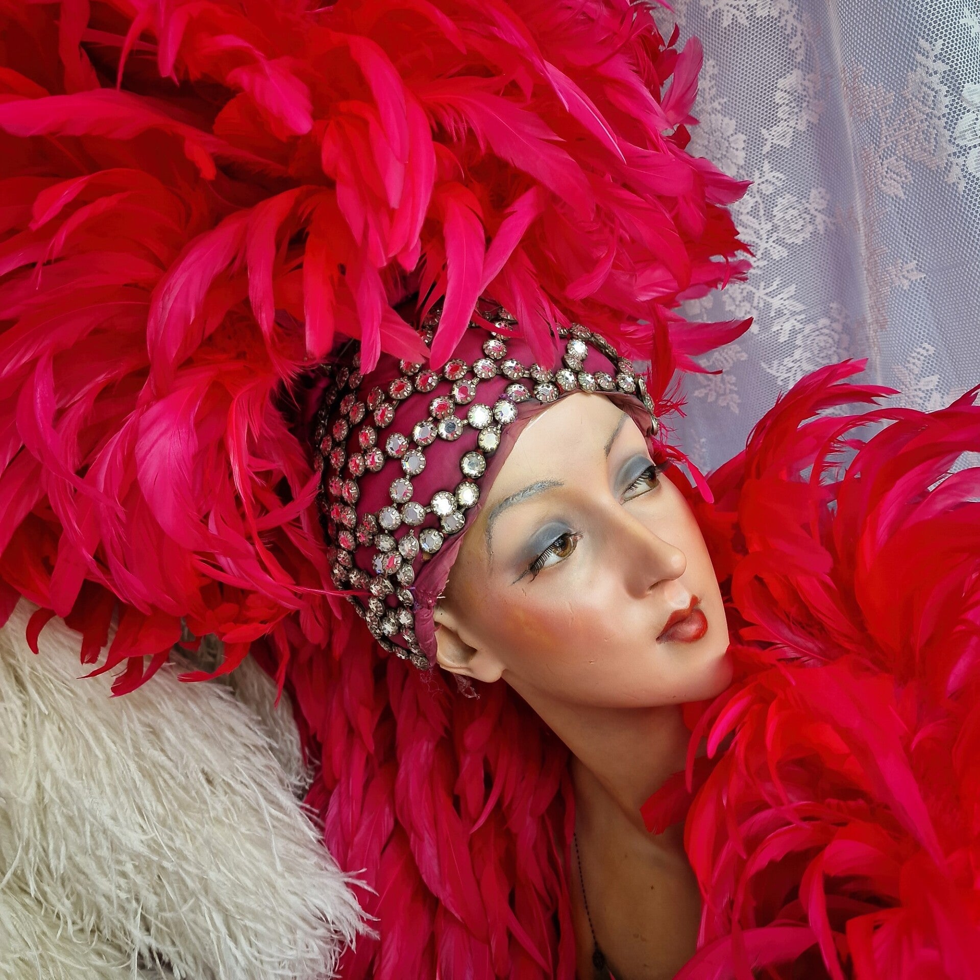 For sale: a unique and stunning vintage headdress straight from the French Folies Bergère. This exceptional piece features thousands of feathers in a vibrant fuchsia pink (appearing more red in the photos). Attached to the headdress are two boas that can be draped or left to hang loose, offering versatile styling options.