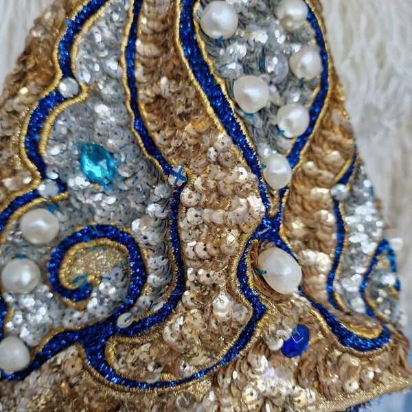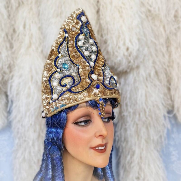 This vintage and stunning headdress, once used in a play at the iconic French Folies Bergère, is crafted in a Kokoshnik style reminiscent of Erté (Romain de Tirtoff). Adorned with rhinestones, stones, and sequins in elegant white, blue, and gold tones, this piece is truly eye-catching. The headdress is made from gold-colored fabric and features an elastic band and iron wire at the back for a secure fit.