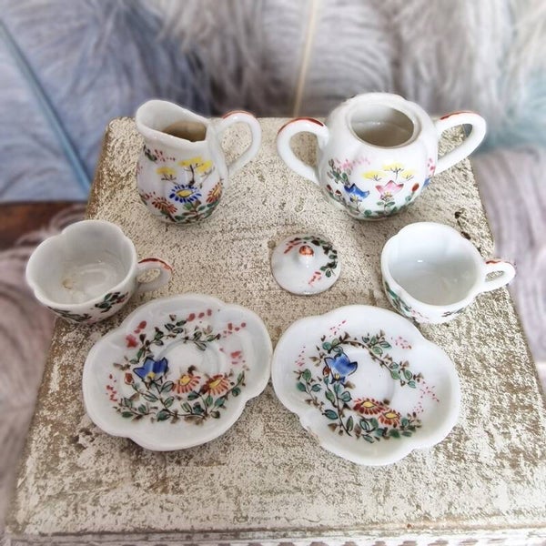 This lovely 19th-century antique Chinese or Japanese miniature tea set is perfect for fashion dolls or a dollhouse. Each piece is beautifully decorated with bright colors, making it a charming addition to any table setting for antique fashion dolls or a dollhouse display. It's also a wonderful find for collectors of exquisite miniatures.