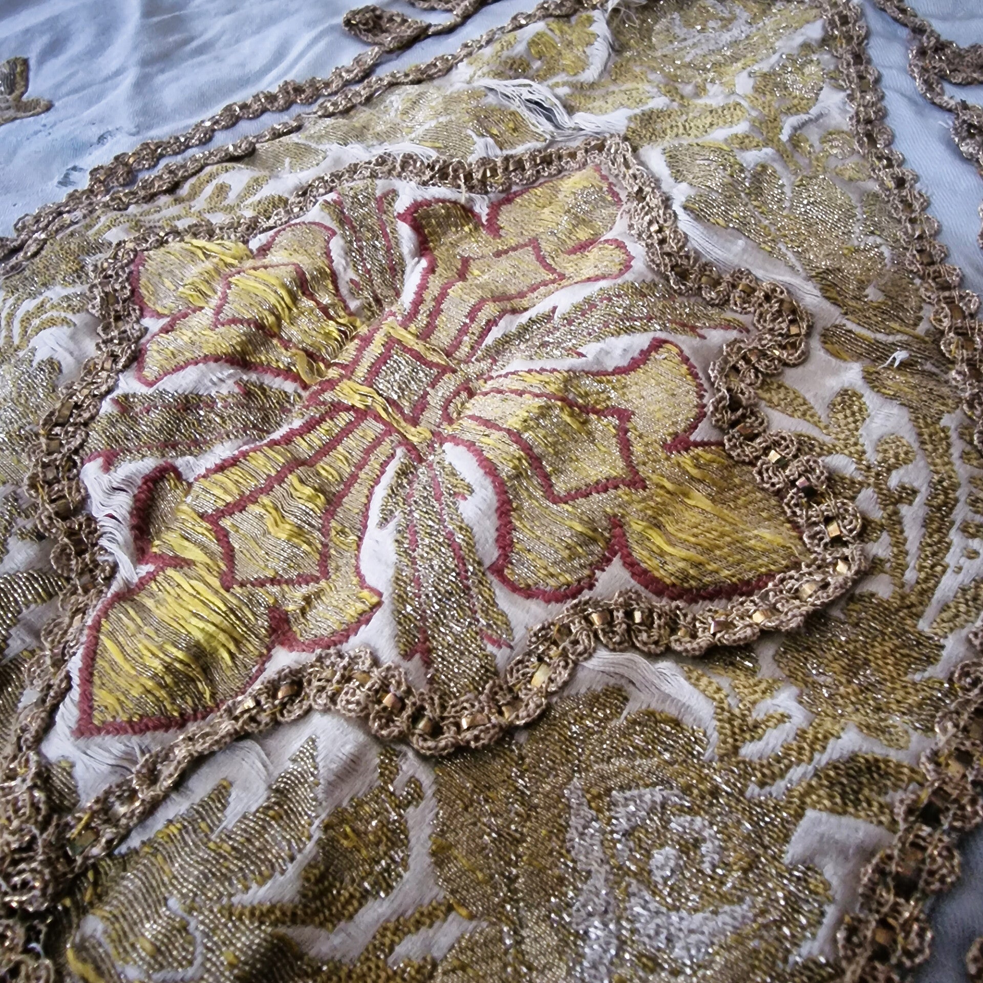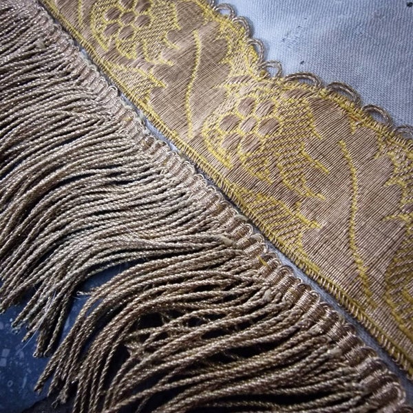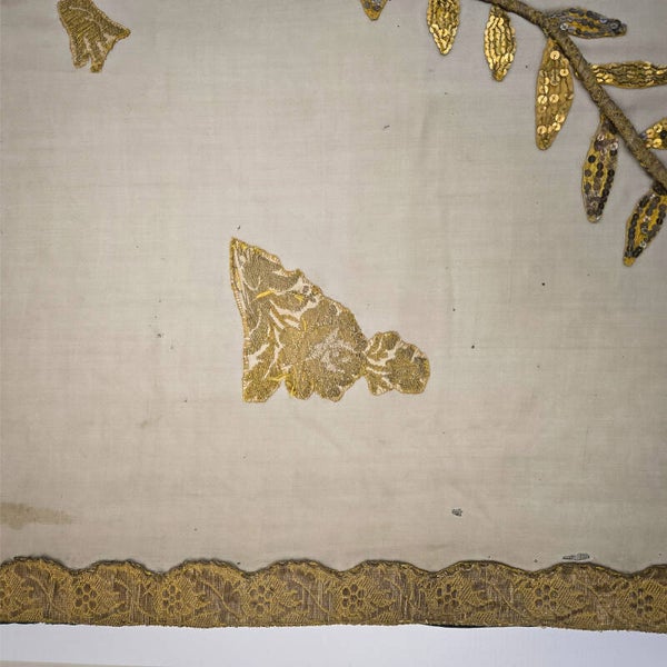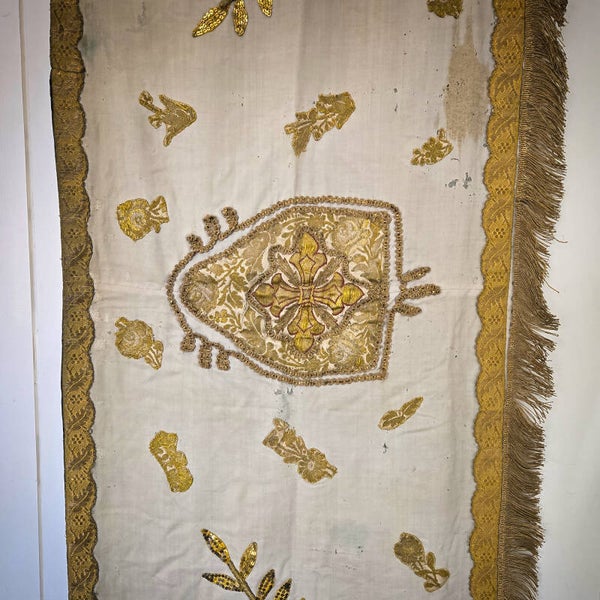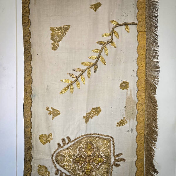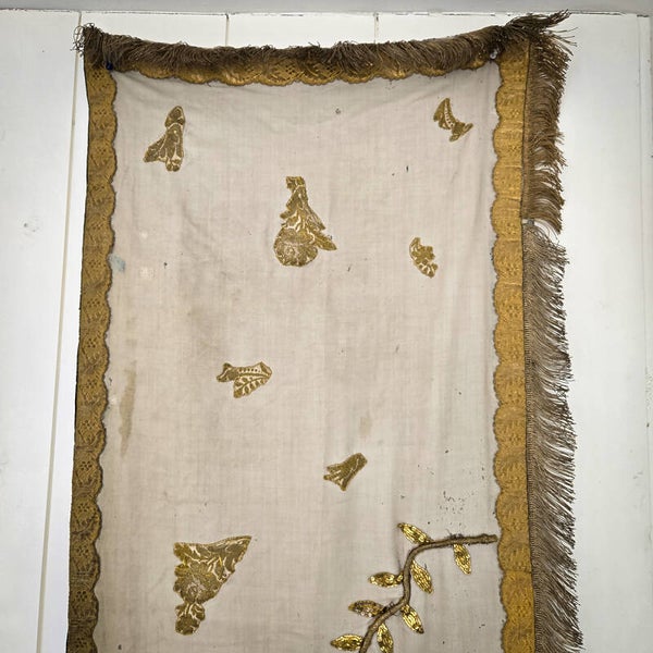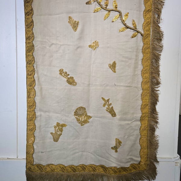 A stunning 19th-century French church altar cloth or religious table runner, showcasing exquisite craftsmanship. This piece is made of ecru silk brocade adorned with intricate gold thread embroidery, shimmering sequins, and bordered with a luxurious gold thread fringe. At its center is a beautifully embroidered image of a miter, adding to its religious significance.