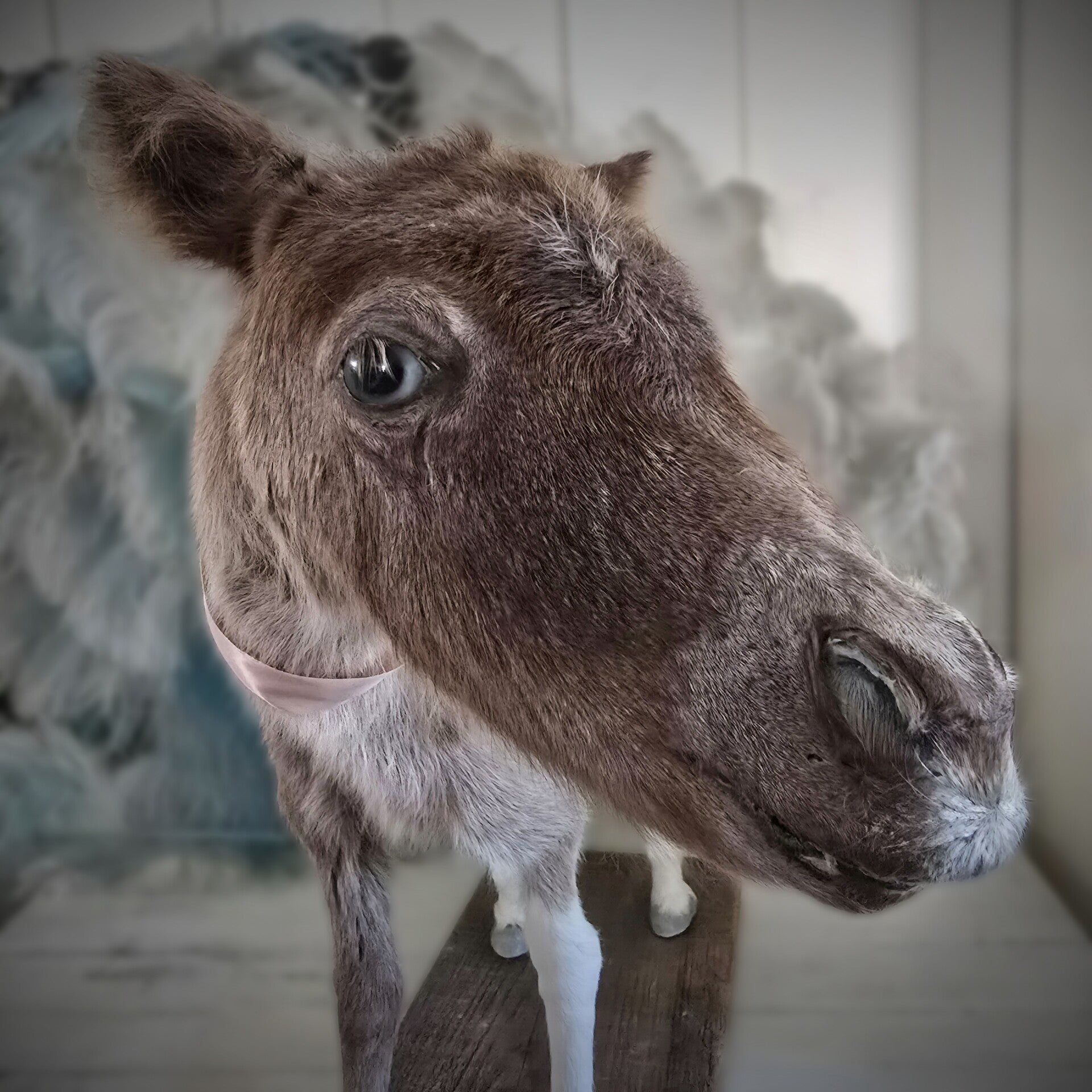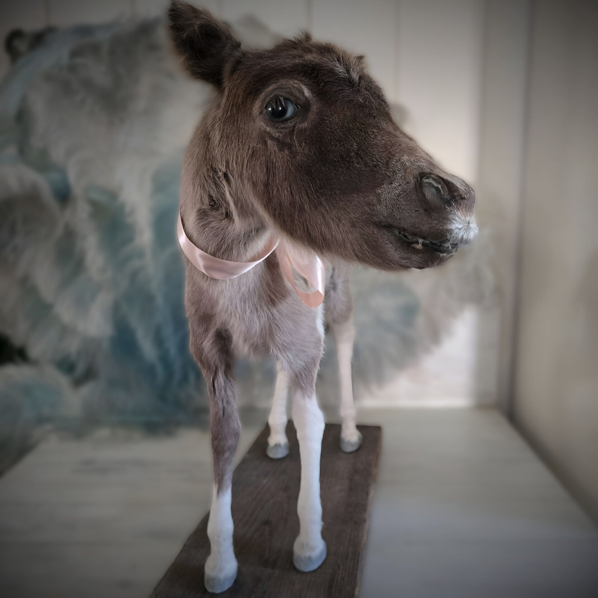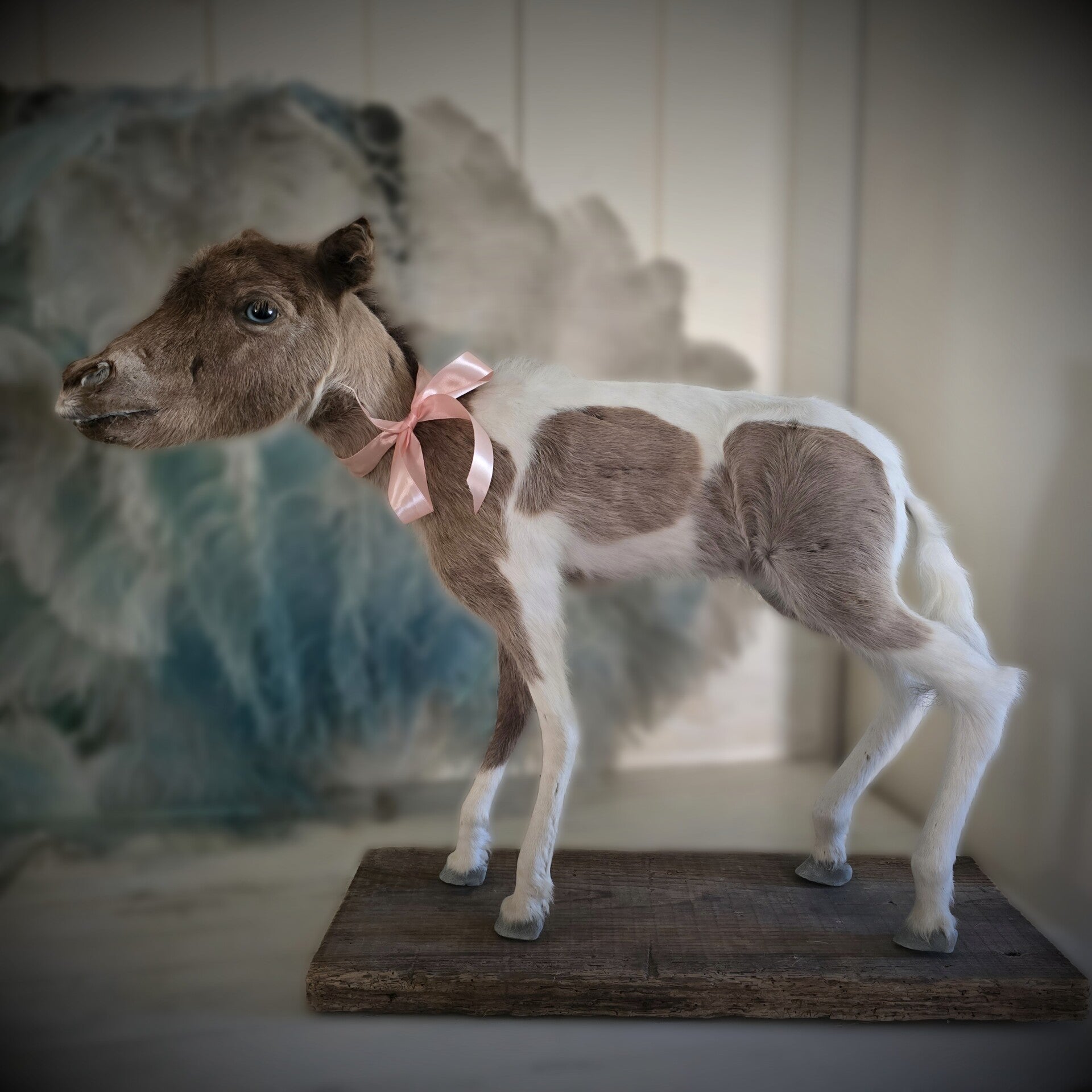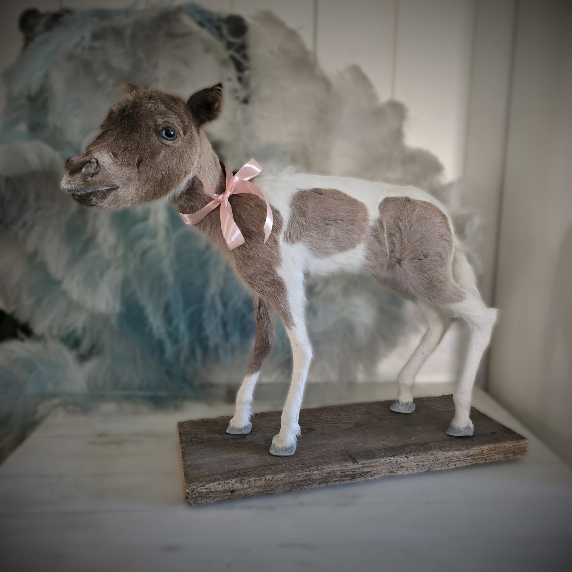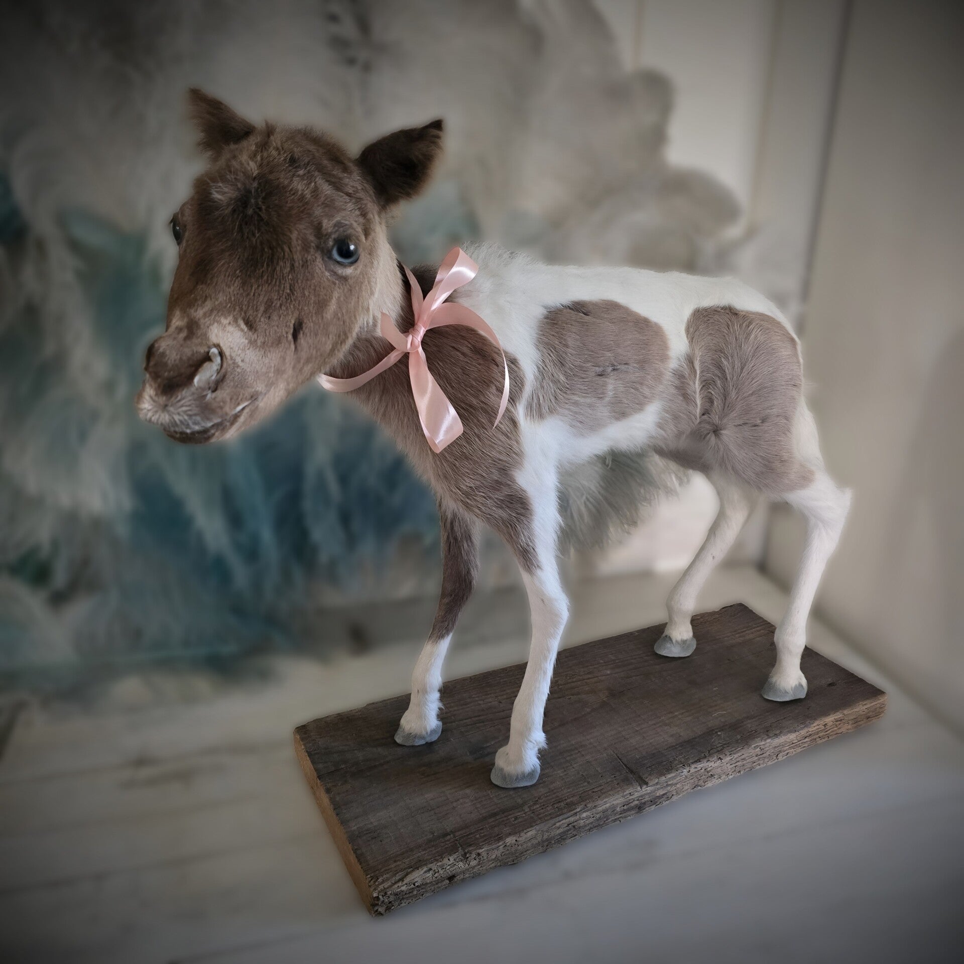 For sale: a beautifully preserved antique taxidermy foal. Probably from the 1940s. This small foal passed away naturally and was mounted to be kept as a cherished family piece. It has a striking coat color and an endearing presence, making it a captivating display item.