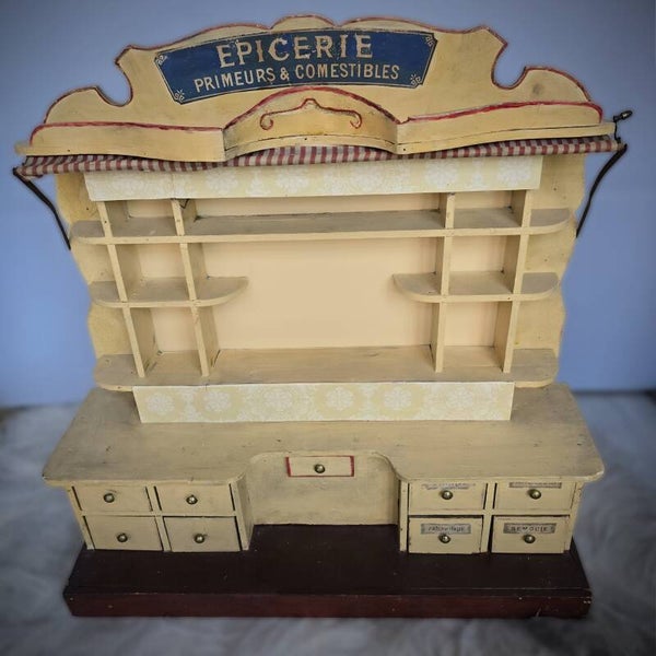 A large paper label at the top, in blue with gold lettering, proudly announces “Épicerie,” immediately evoking the atmosphere of a quaint neighborhood shop. One of its most charming features is the original red-and-white striped fabric awning, which still works with a bit of gentle care — a rare detail that adds wonderful character.