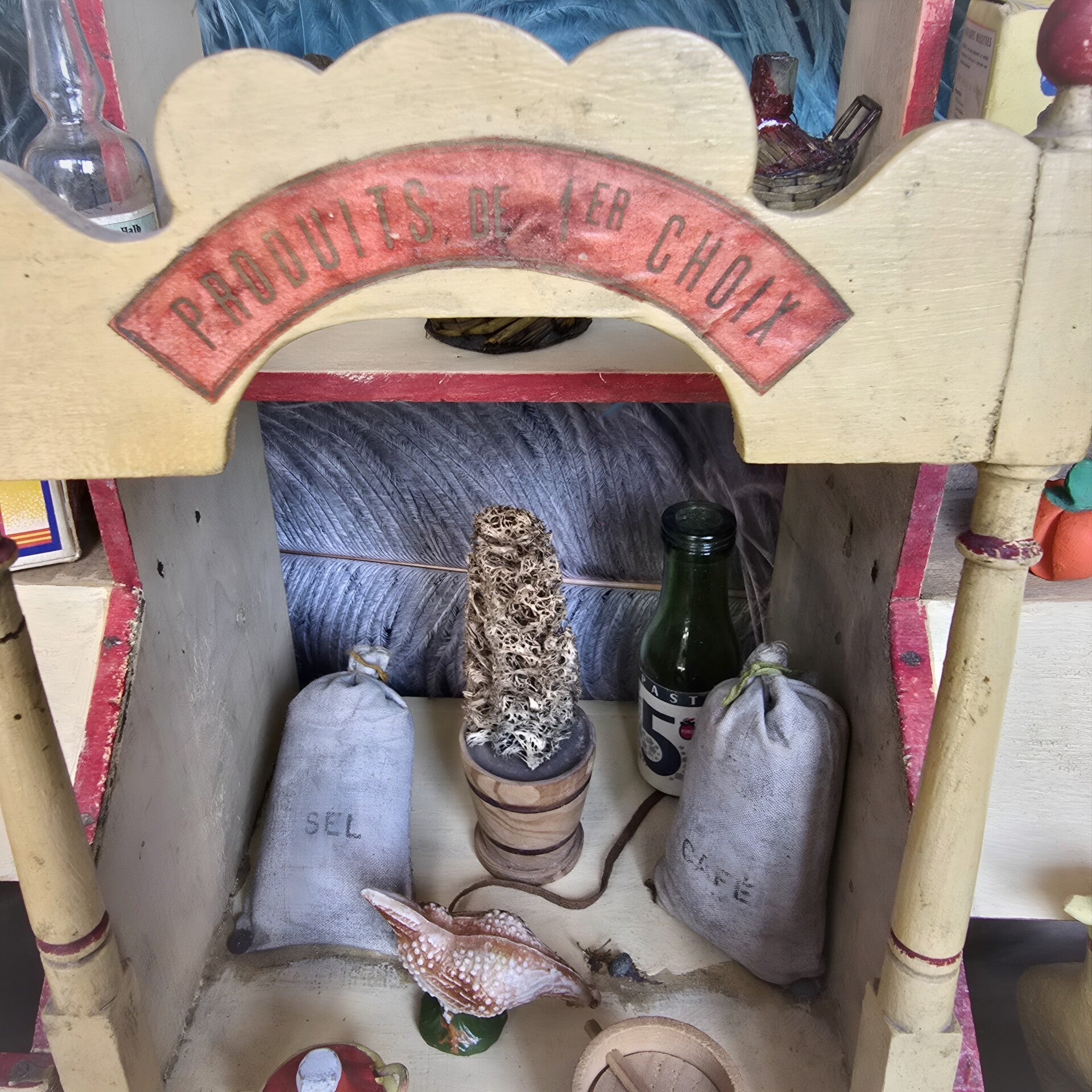 This beautiful French wooden grocery store — a so-called Épicerie — dates from around 1900–1920 and is painted in a soft cream or pale yellow, with lovely red and gold accents.