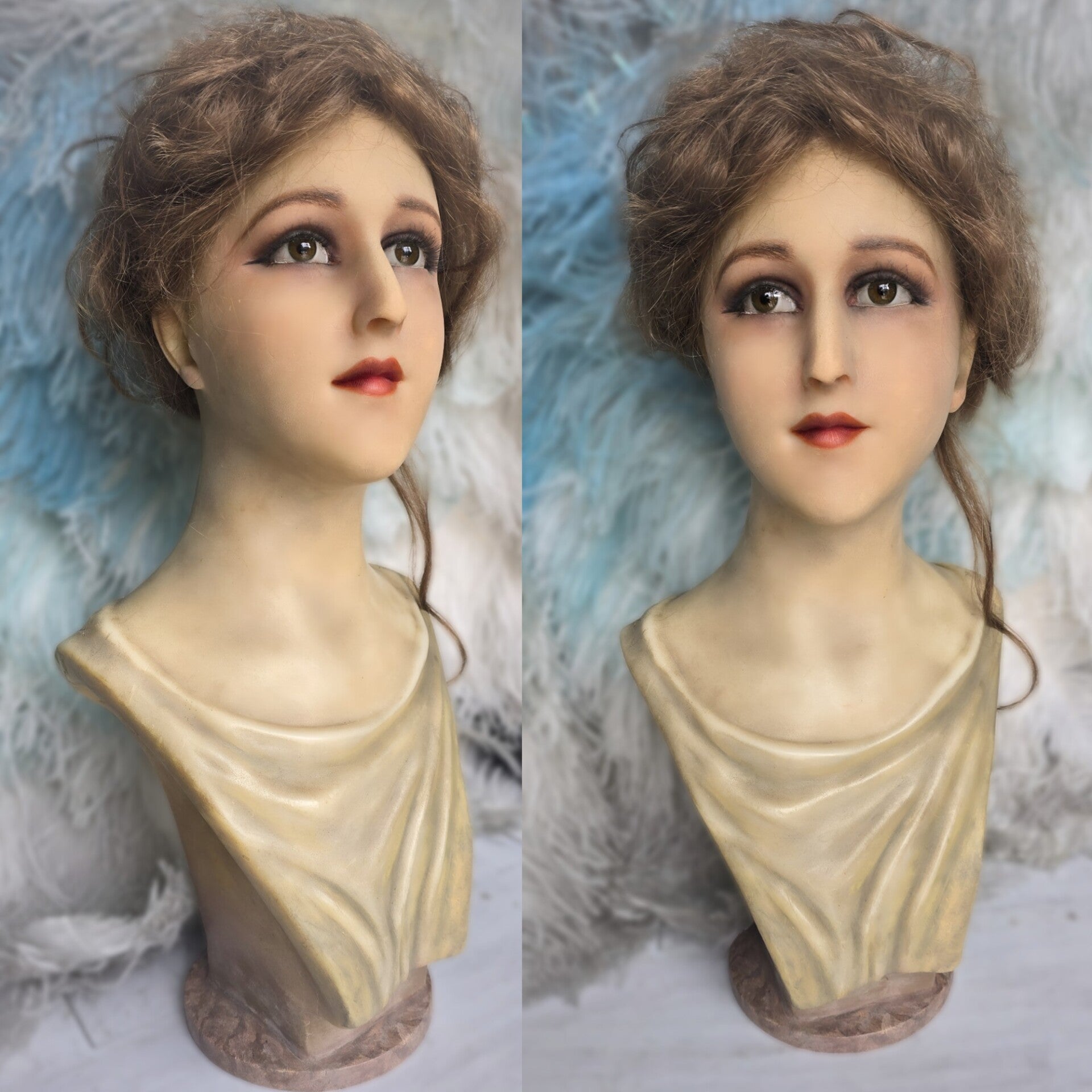 Beautiful Wax Life-size bust mannequin from France in 1920. She has a beautiful face with a detailed expression, a real Art Nouveau Lady from that period from France. She has real eyelashes and a beautiful Antique wig. She can be dressed or just plain showing her body. These kinds go mannequins are very rare, do not survive the time, and especially in this perfect condition. they used these kinds of mannequins as show models for hats, scarves etc in the windows of these 1920's Parisian fashion boutiques.