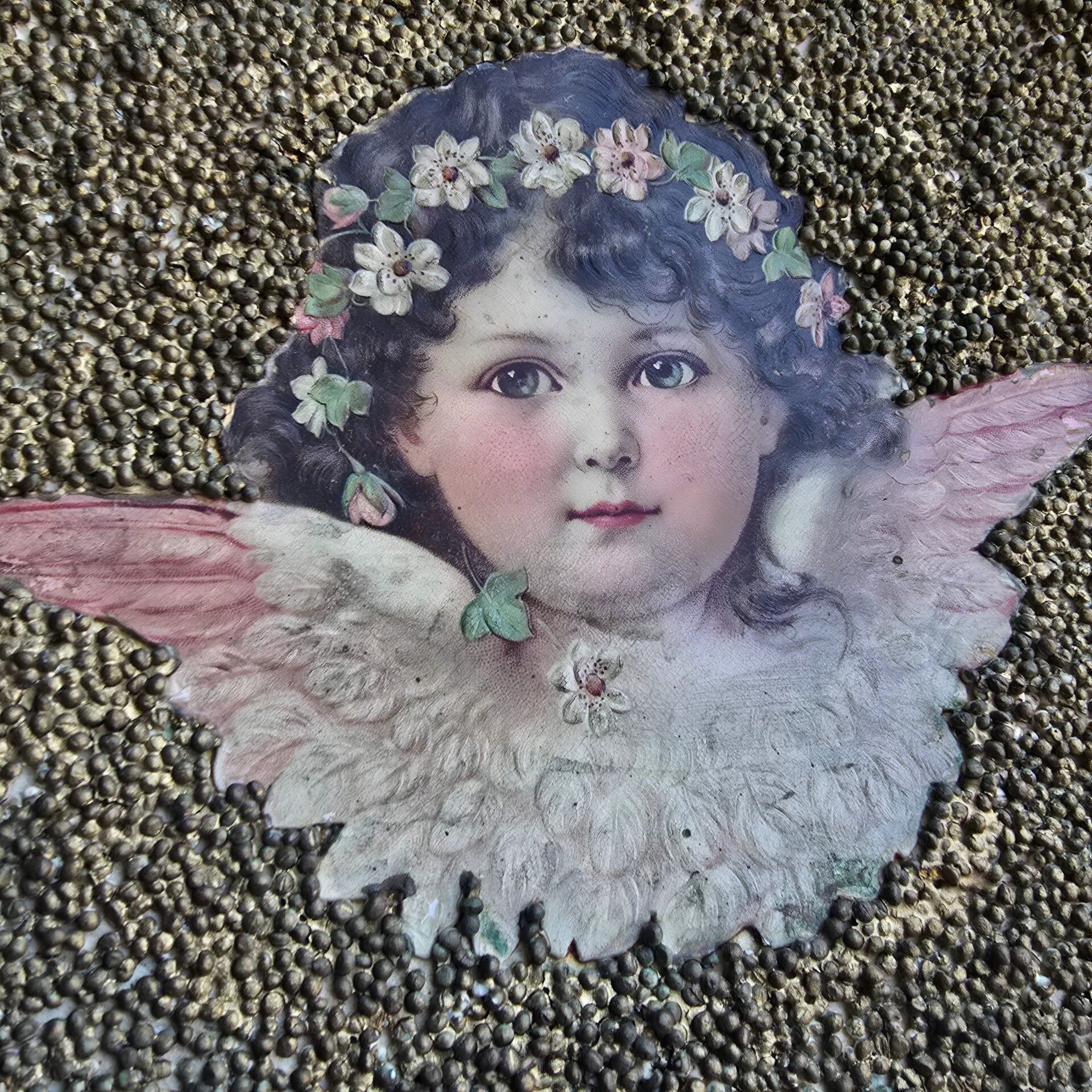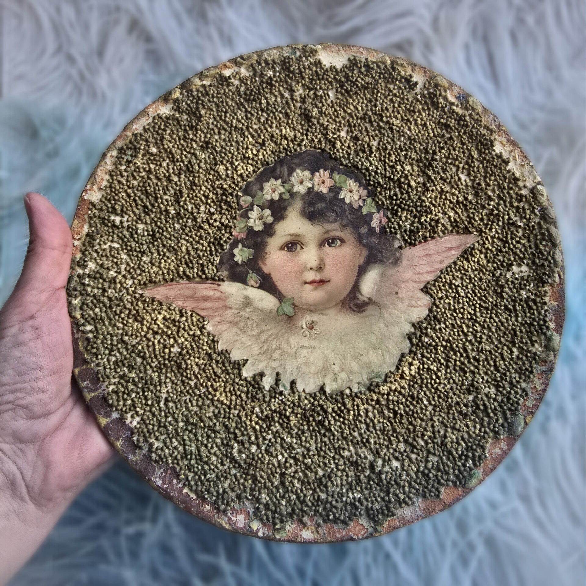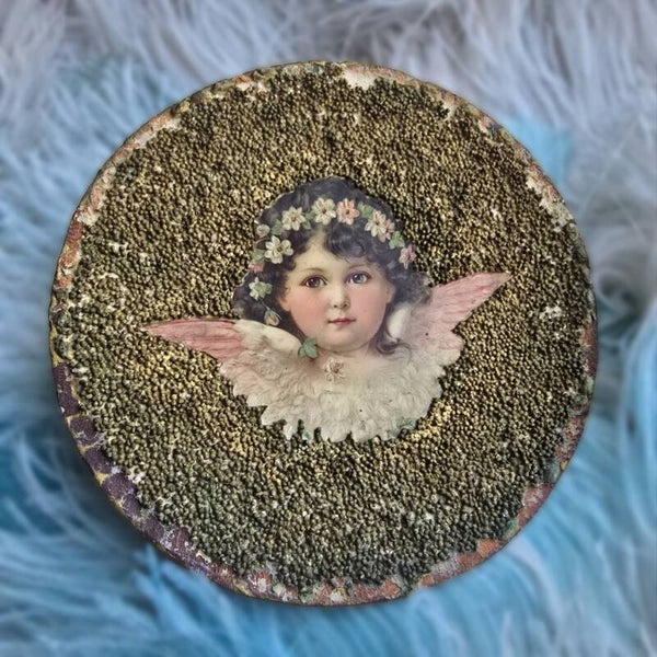 Each lid features a beautifully detailed paper image of a cherubic angel at the center—one with pink wings, the other in soft blue—surrounded by hundreds of hand-applied gold-toned seeds, creating a rich, textured halo effect. The original silk ribbons still remain attached to the ceramic handles, suggesting they were once displayed hanging.