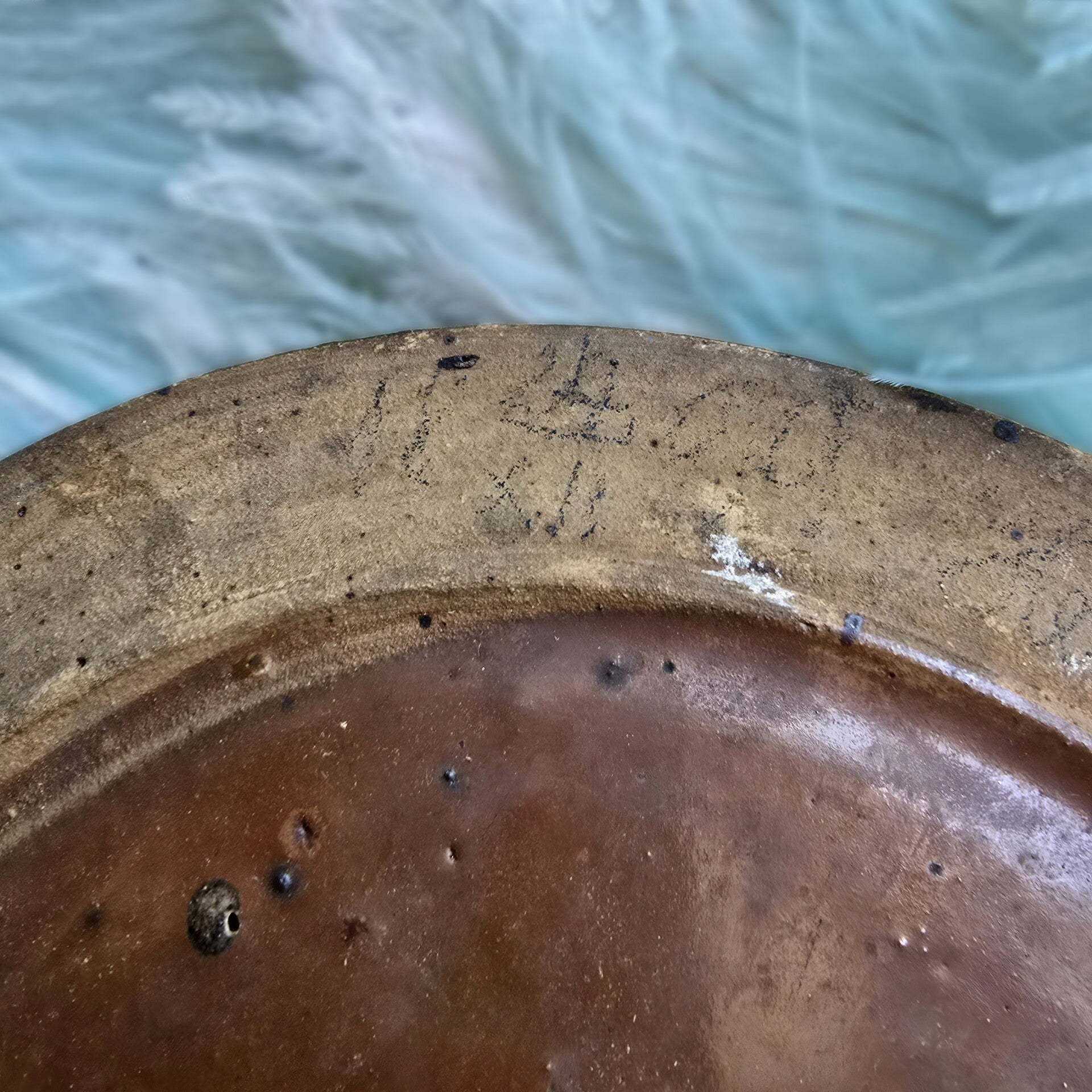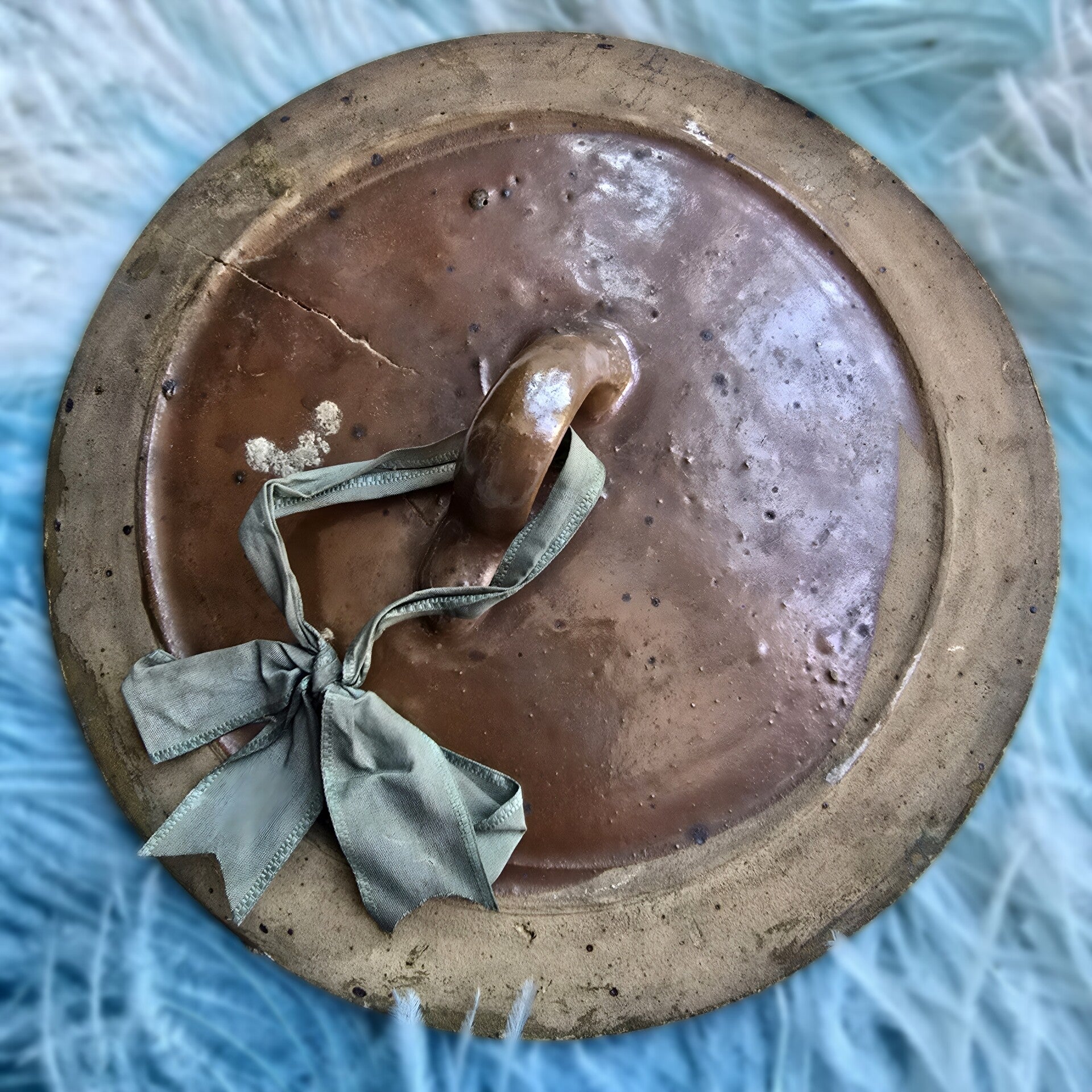 These two remarkable decorative pieces were crafted using large antique French earthenware lids, likely from old cooking or provisions pots. One of the lids is inscribed with the date 1899, which may correspond to when they were artistically embellished.