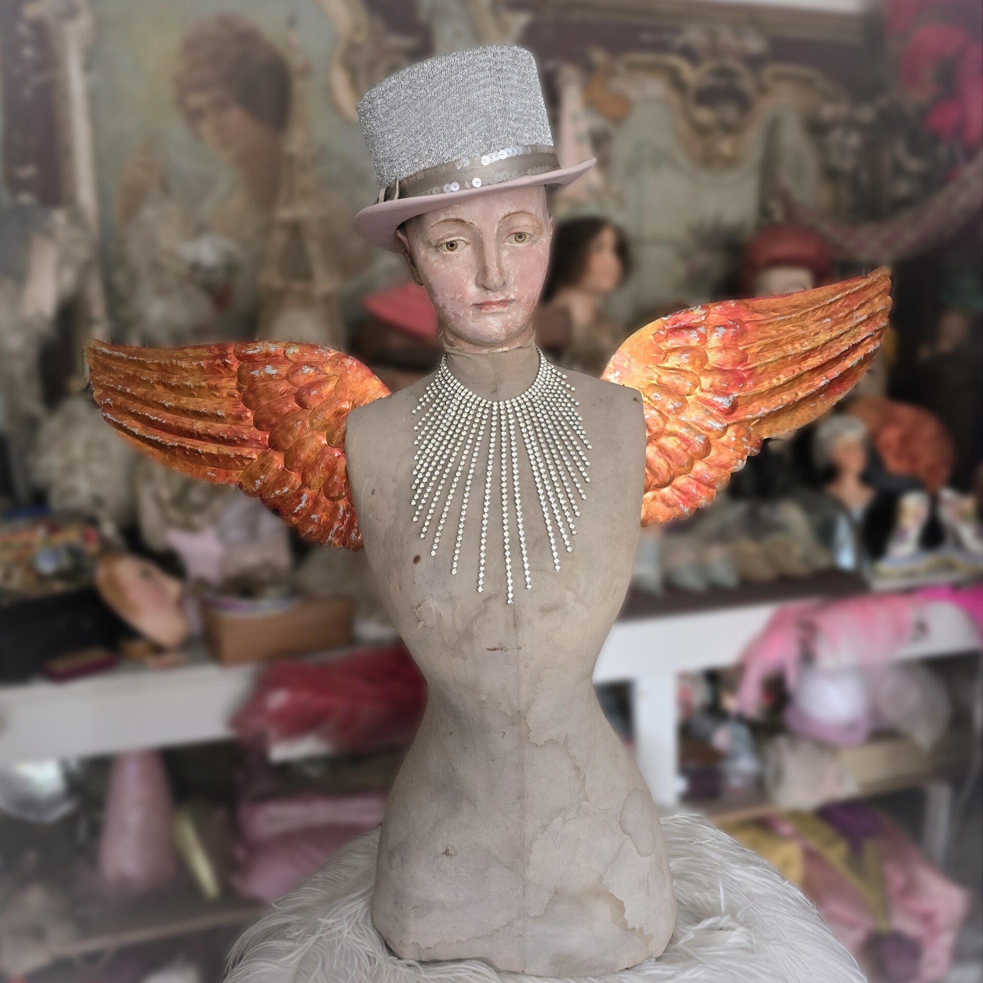 They make a striking decorative object: whether displayed in a nursery, studio, or as part of a theatrical setting, they add a whimsical and nostalgic charm. Easily mounted with thumbtacks, as shown here, they are a versatile piece full of character and history.
