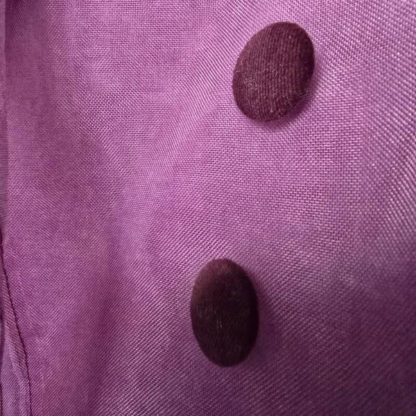 Perfect for a sultry burlesque performance or as a captivating decor piece, this jacket exudes boudoir charm. Its translucent fabric offers a tantalizing glimpse while maintaining an air of mystery. The deep Purple/Pink hue, complemented by the contrasting velvet collar, catches the light with a subtle shimmer reminiscent of stage glamour.